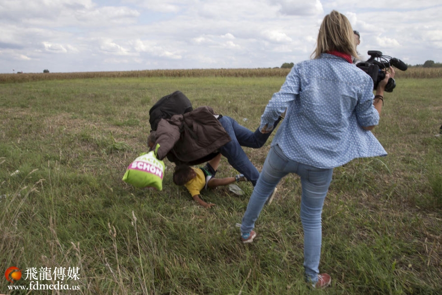 图十三:2015年9月8日,一位难民和孩子在试图逃离匈牙利勒斯凯收容点时被一位TV摄像女记者伸脚绊倒。她还在现场踢了一个难民儿童。社交媒体上迅速传播了她的所作所为,这位女记者后因自己的错误行为被解雇。