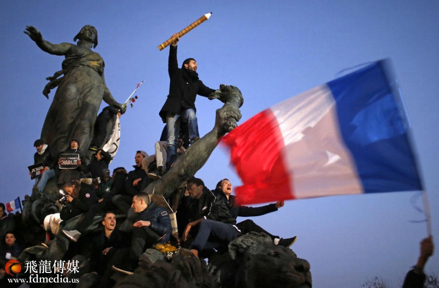 图十五: 2015年1月11日,一位男子手持巨大的铅笔,参与当时上万人参加的游行,反对一伙武装人员袭击位于巴黎的法国讽刺漫画杂志《查理周刊》(Charlie Hebdo),造成12人死亡,多人受伤的巴黎暴力犯罪袭击事件。