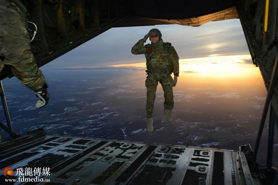 图十四:2015年2月24日,在德国一处降落区的上空,一位空军特种部队美国士兵在准备跳出机舱前,向同仁敬礼。