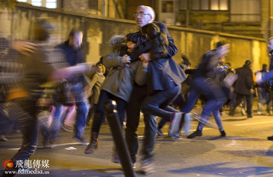 图十七:2015年11月15日,巴黎恐袭中一位男子带着两个孩子在恐慌默哀的人群中奔走,周日街道上布满了法国军队士兵,这座着名的旅游城市的风景名胜全部关闭。拍摄时的这场骚动后来被证实是一场假警报引起。