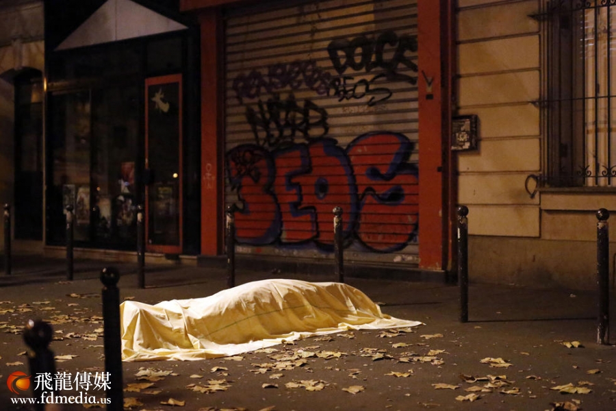 图十六:2015年11月13日,造成130人死亡的IS巴黎恐袭事件,事发地点之一的巴塔克莱恩剧院门外一位遇难者被盖上了白布。