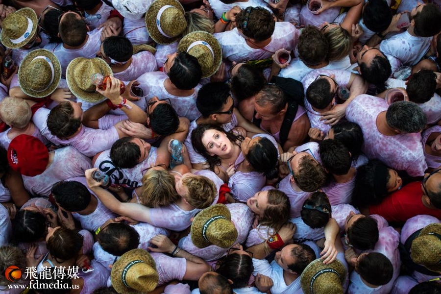 图十八:2015年7月6日,西班牙潘普洛纳市摩肩接踵的狂欢者们在尽情享受圣佛明节的开幕庆典。