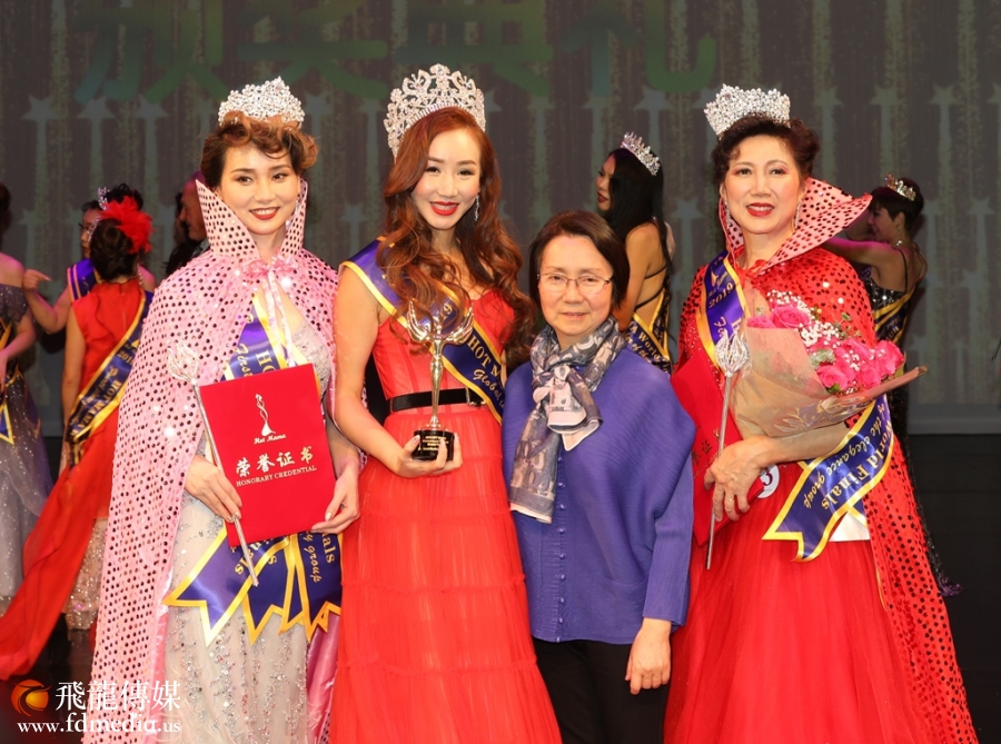 归亚蕾女士为 2019 HOT MAMA International Pageant World Finals “优雅组”冠军 来自加拿大的13号殷伯英和 “活力组”冠军来自加拿大的 2 号张晓丹颁奖。