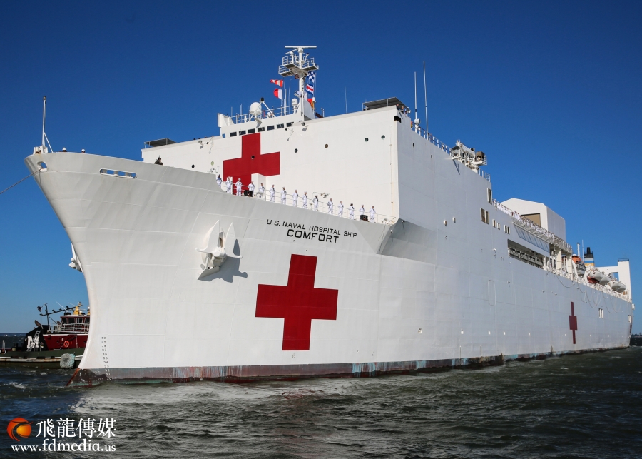 因纽约感染冠状病毒超过三千例,疫情告急,白宫急派海军医疗舰前往支援,海军「舒适号」(USNS Comfort)、「仁慈号」(USNS Mercy)和「安慰号」三艘支援纽约,第三艘Comfort医疗船从弗吉尼亚州Norfolk母港驶入纽约市停泊。
