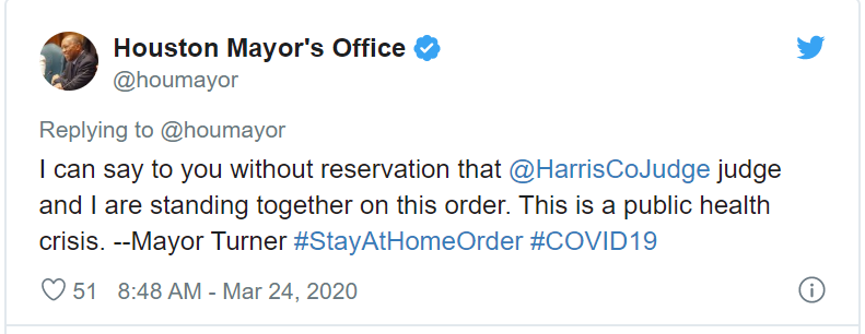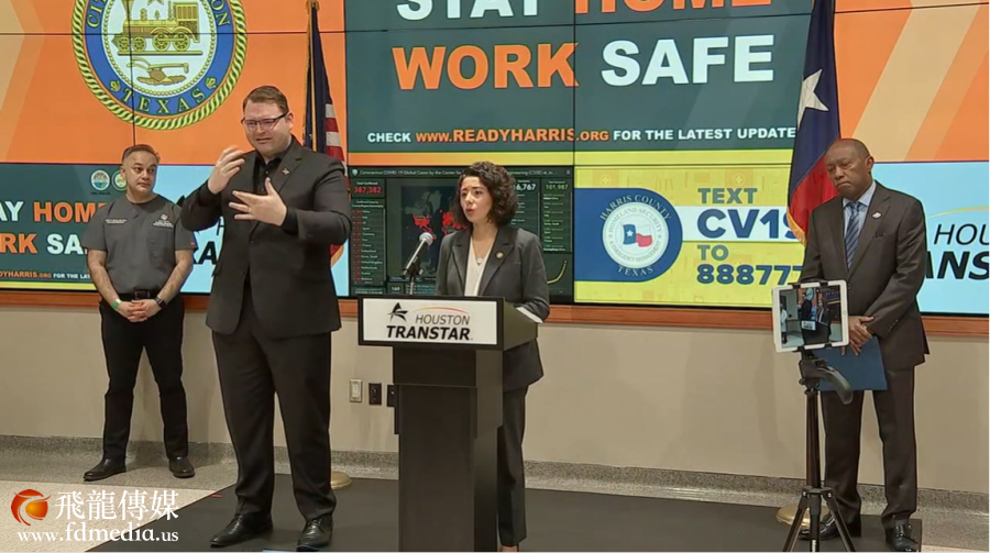 3月24日,休斯敦市长举行新闻发布会,由哈里斯县(Harris County)法官Lina Hidalgo宣布休斯敦民众“留在家中-安全工作令”,以帮助对抗COVID-19的传播。