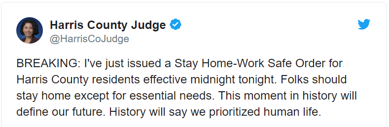 哈里斯县法官莉娜·伊达尔戈(Lina Hidalgo)在一条推文中说,除了基本需要外,人们应留在家中。 休斯敦市长西尔维斯特·特纳(Sylvester Turner)回应了伊达尔戈(Hidalgo)的讲话。