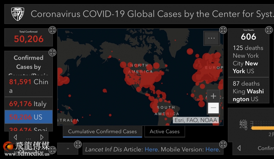 3月24日下午2:22分,根据美国疾病控制与预防中心(CDC)官网公布全美冠状病毒肺炎确诊破50206人,死亡606人。纽约市死人125人,疫情全美最高。