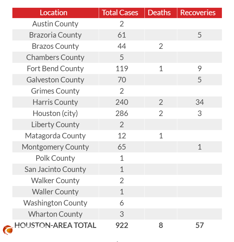 根据休斯敦电视台2频道报道;截止3月29日,休斯敦地区冠状病毒病例上升至922例,死亡8例,康复57例。