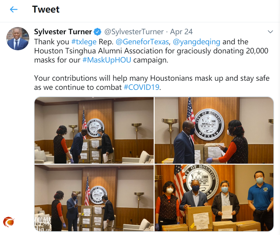 Houston Tsinghua Alumini Association Donated 20,000 disposable masks to City of Houston on Friday, April 24th,2020. That becomes part of Mayor Sylvester Turnor's handout donation plan to Houstonians.