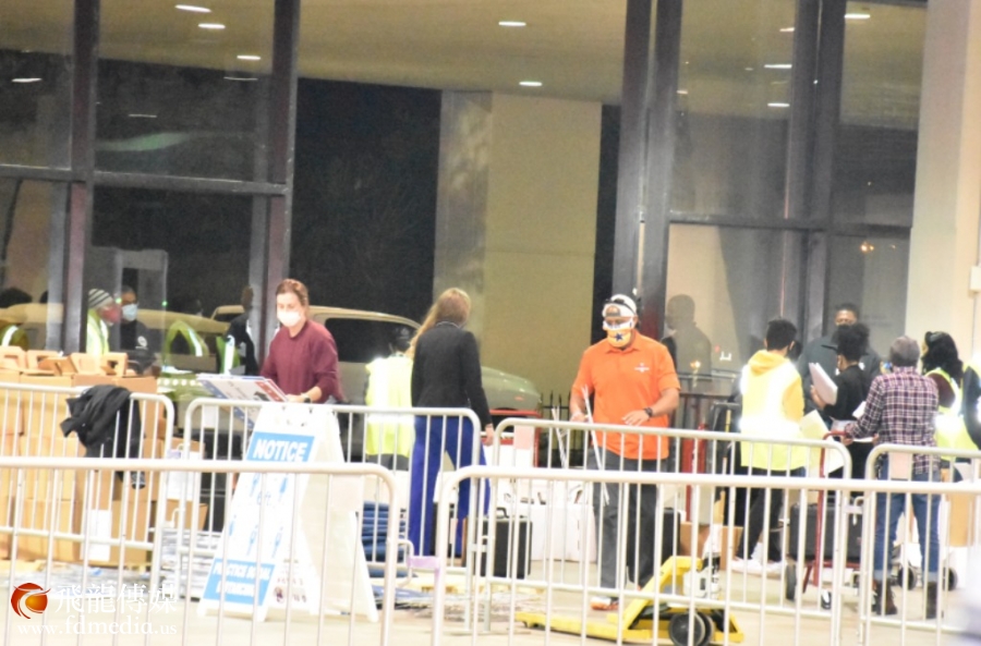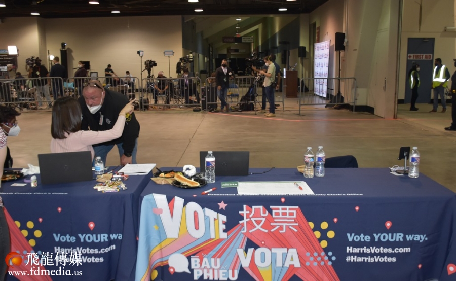 美国飞龙传媒记者 Angelina Chen在哈里斯县计票中心NRG Arena体育馆计票中心的报道。