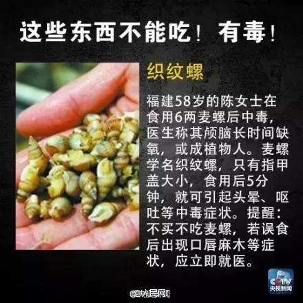 早在2012年,卫生部就发公告称:浙江等地发生多起因食用织纹螺引起的中毒事件。织纹螺主要分布于浙江、福建、广东沿海。引起织纹螺中毒的主要原因是其含有的河豚毒素,食用后可产生头晕、呕吐、口唇及手指麻木等中毒症状,潜伏期最短为5分钟,最长为4个小时。对食用织纹螺引起的中毒,目前尚无特效治疗解毒药物。