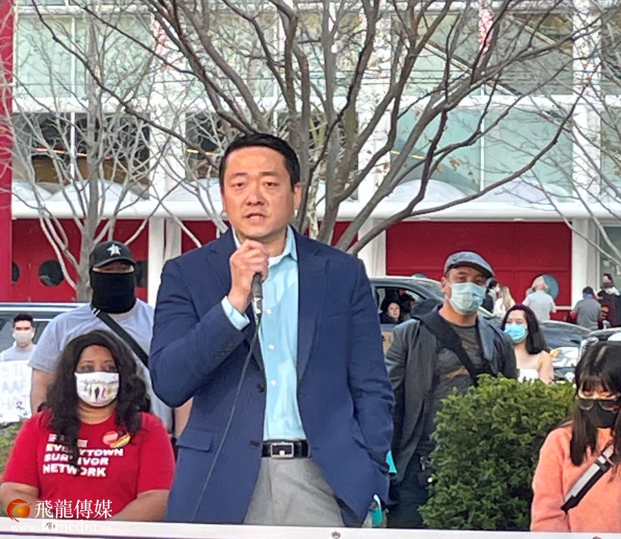 德州华裔州议员吴元之在演讲中呼吁,当受到种族歧视的时候大家应该勇敢发声,反对暴力。