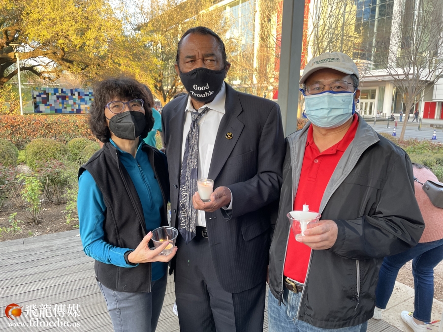 亚商会前主席赵鈭军(右)、美国国会议员Al Green (格林)、亚商会前总裁Linda Toyota手托蜡烛,为在亚特兰大按摩院枪击案中的受害者哀悼。