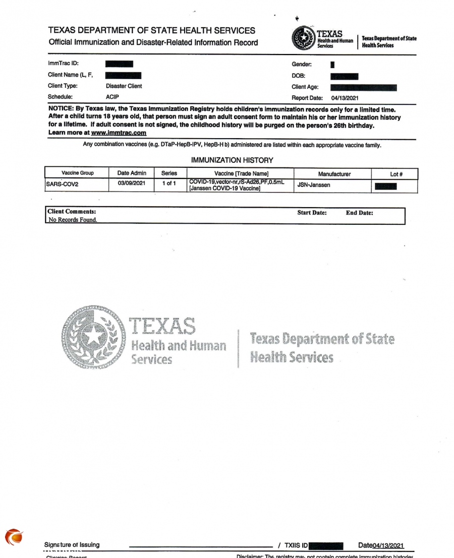 美福药局提供州政府接种疫苗证明。