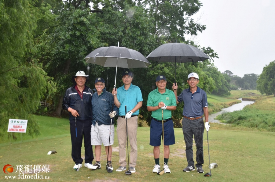 吴文龙董事长在雨中为球赛开球,德州中文台 Iris Chen 为他撑伞。