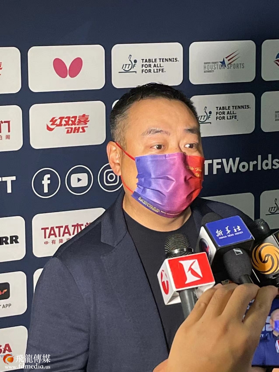 中国乒乓球协会主席刘国梁接受记者采访。