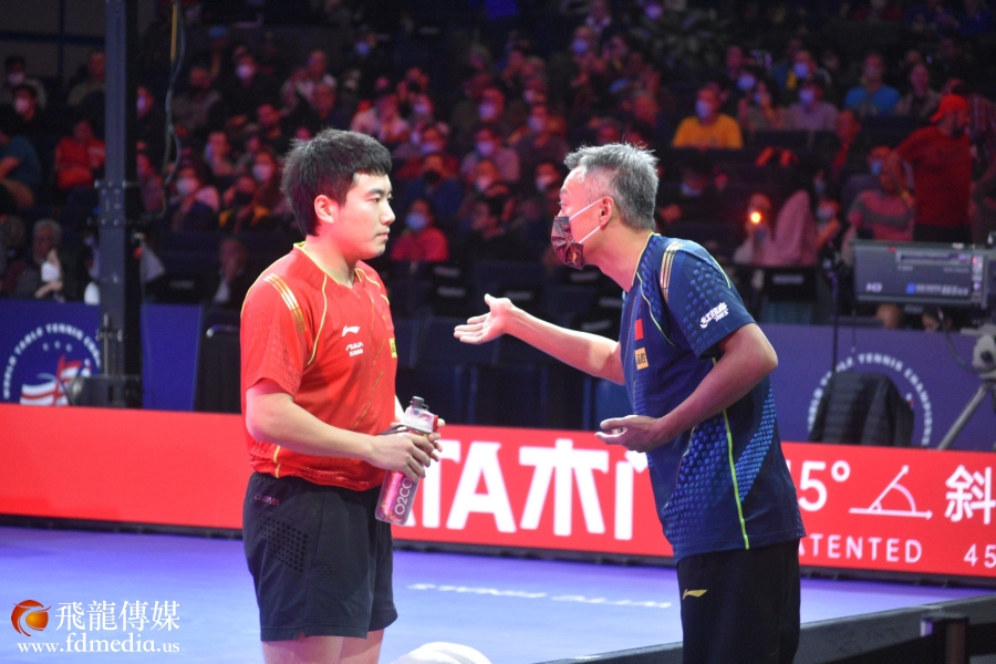 主教练秦志戬在给梁靖崑指导