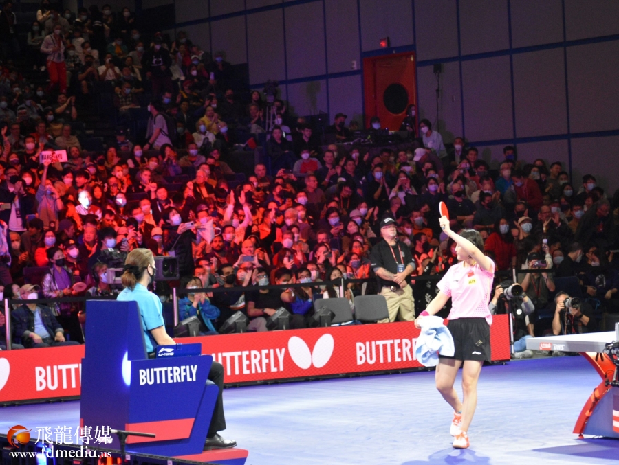 陈梦在离开赛场时,向支持她的观众挥手。