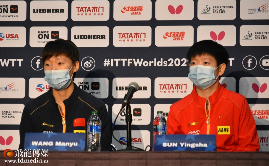 王曼昱/孙颖莎在媒体区接受采访。