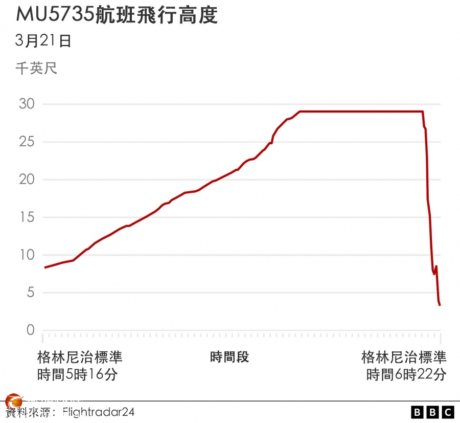 朱涛此前表示,MU5735航班星期一北京时间13:16(格林尼治标准时间05:16)从昆明起飞,14:17保持巡航高度8900米进入广州管制区(广州飞航情报区)。至14:20,管制员发现飞机高度急剧下降,多次呼叫机组,但未收到任何回应,14:23飞机雷达信号消失,其后证实坠毁。