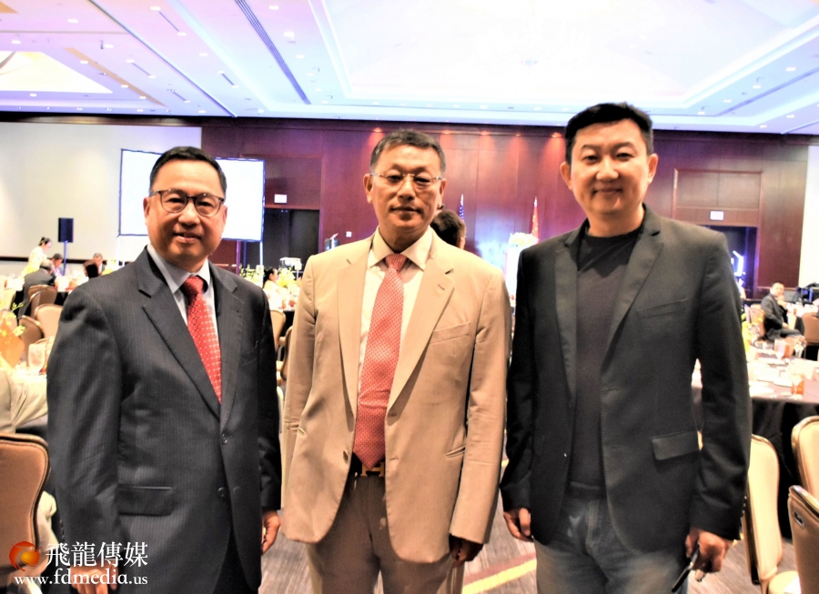 左起:亚商会前主席喻斌、中国人活动中心董事会董事著名慈善家杨万清博士、美南报业电视传媒集团总编盖军出席晚宴。
