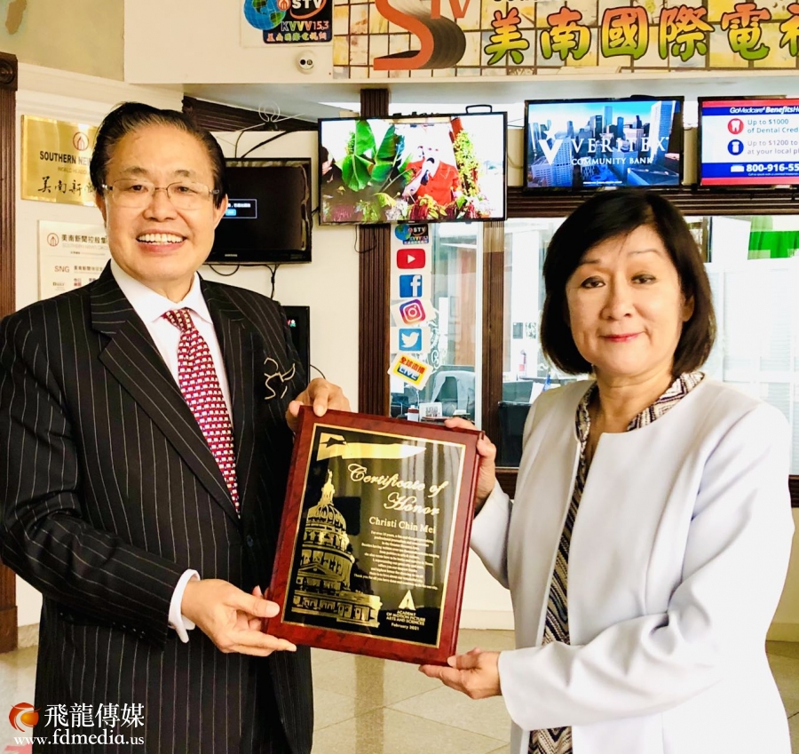 美南新闻集团董事长李蔚华为作家、资深媒体人秦鸿钧颁奖。