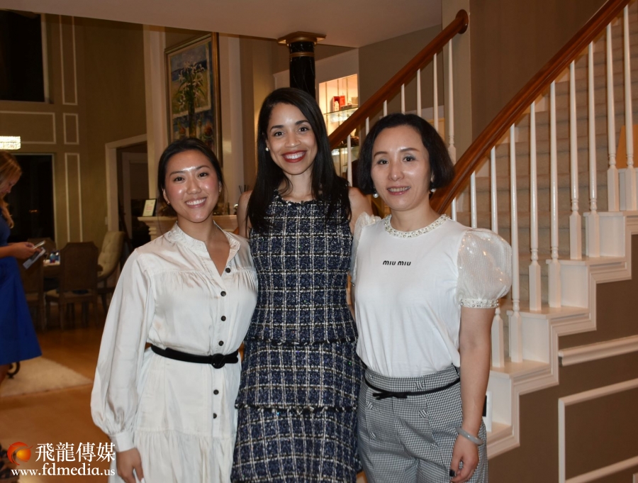 筹款晚宴的主持人 LEONA CHEN (左)、 LI SAIlY SHA(右)与阿曼达(中)合影。