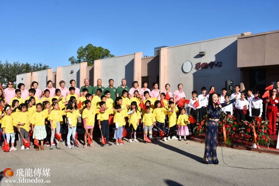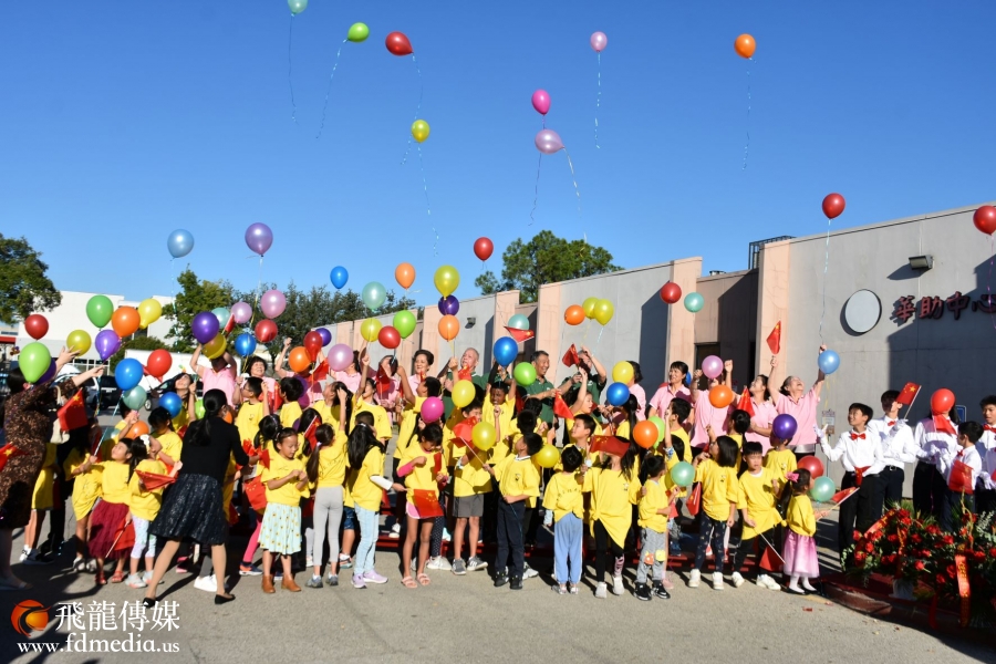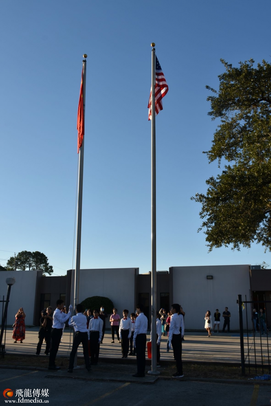 升旗仪式在上午8点半正式举行,由华夏中文学校10位小朋友组成仪仗队庄严神圣,当音乐响起,休斯敦青年歌手现场演唱中美两国国歌,两面旗帜在空中飘扬,和平鸽与五彩气球腾空飞起,小朋友们摇摆着手中的五星红旗欢呼跳跃,这标志着华侨华人预祝中美两国永远友好!