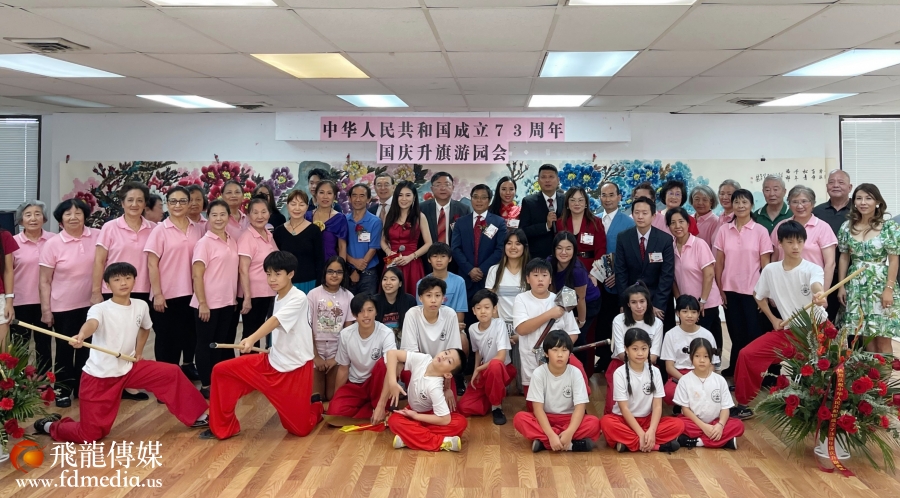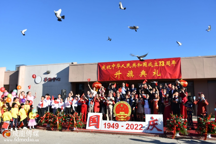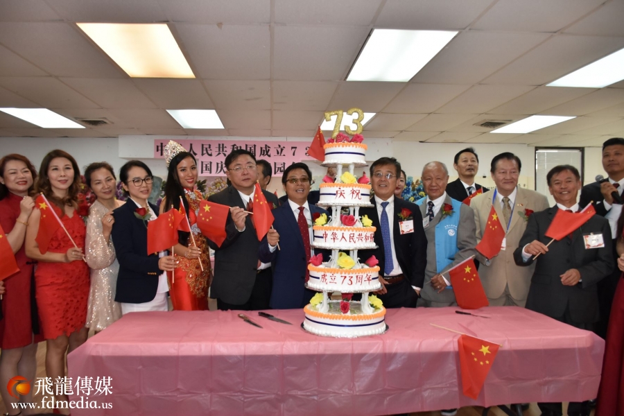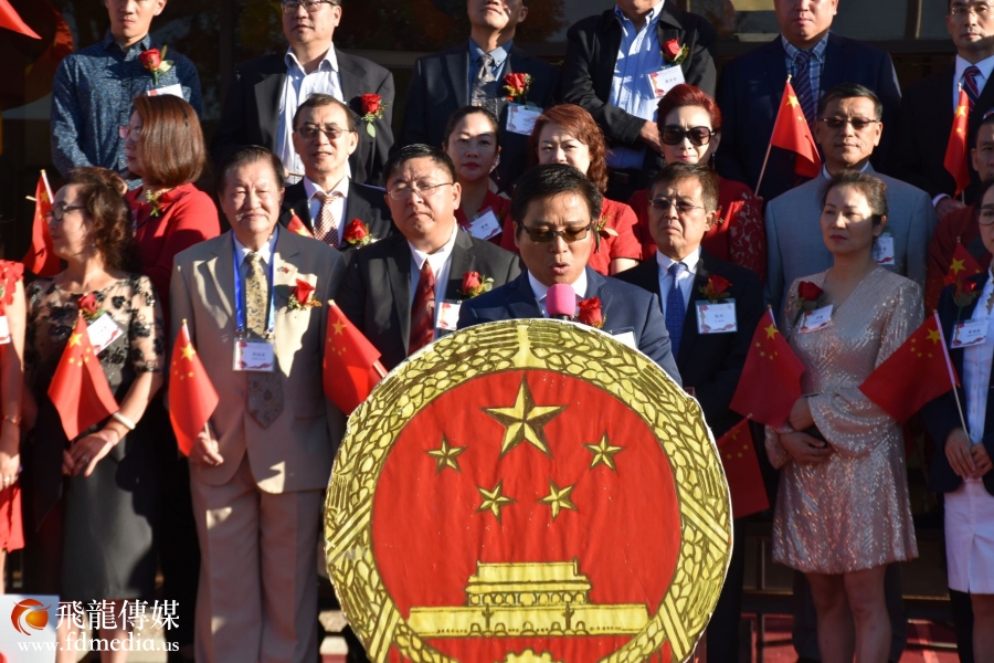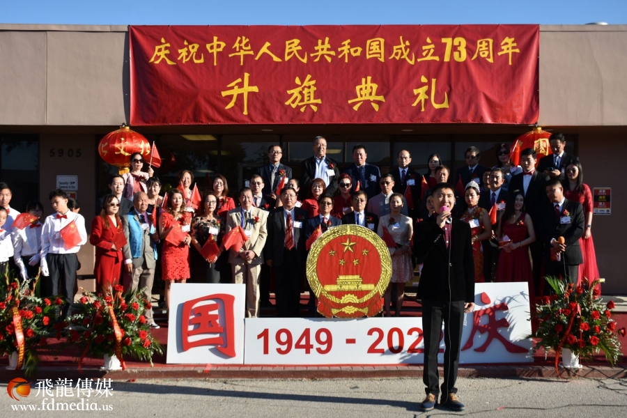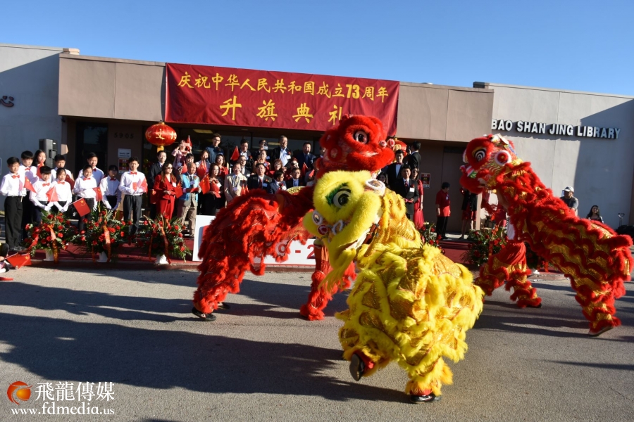 10月1日上午,在休斯敦中国人活动中心大楼前,龙狮飞腾,彩旗飘扬热闹非凡。休斯敦侨界名流、社团领袖、各界杰出人士、留学生齐聚一堂庆祝中华人民共和国成立七十三周年。