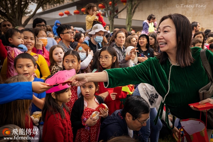 几千名各族裔民众携家带口,很多人穿着中国服装,现场欢声笑语,人声鼎沸,洋溢着浓浓的过年气氛。此次活动吸引了四千多人前来参加,𣎴同的肤色,相同的笑睑,共度中国年!