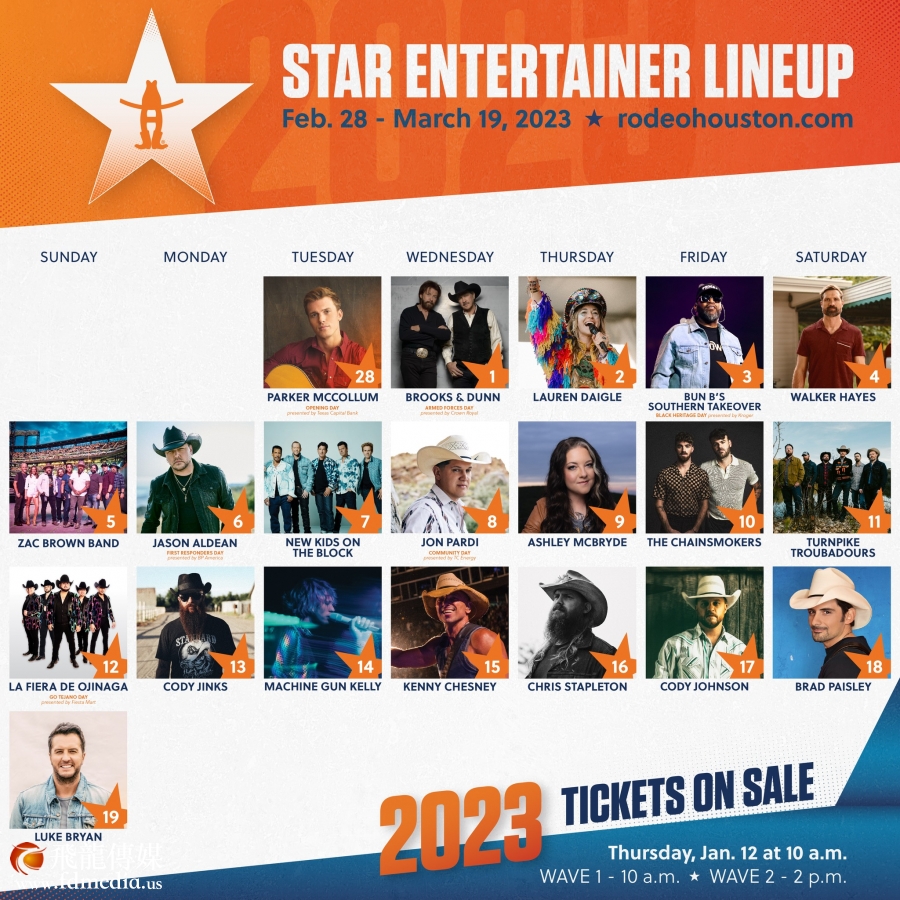 2023 牛仔节巨星云集,Houston Livestock Show 和 Rodeo 官員發布了 参加2023 年 Rodeo 演出明星陣容。他们包括鄉村歌手、電子舞曲、嘻哈、北歐、流行、搖滾和基督教歌曲等多種音乐流派 . 很多藝術家是在 2023 年首次亮相 牛仔节。
