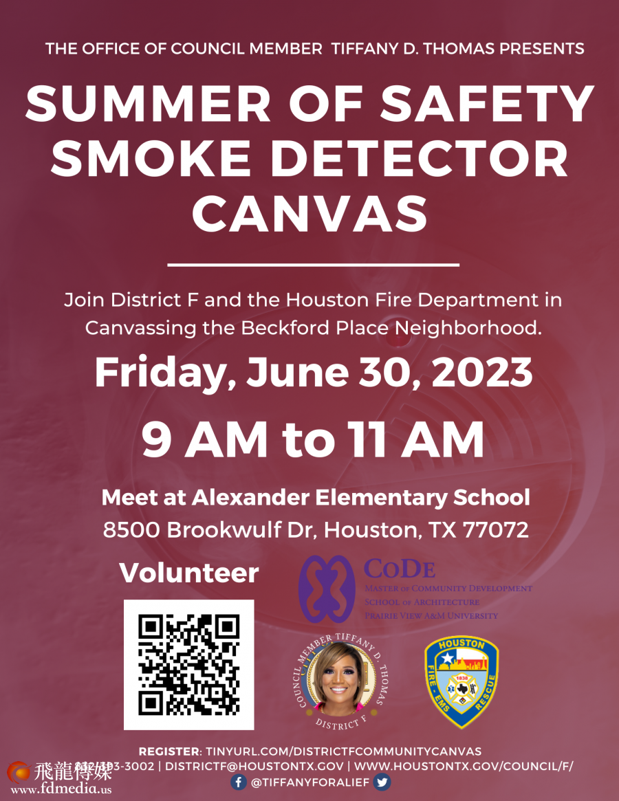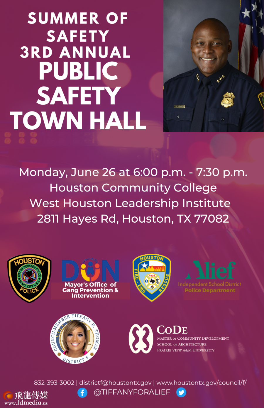 • F 区市政厅会议:6 月 26 日下午 6:30 在 HCC 西休斯顿研究所举行,市官员、议会成员和部门代表的参加。
