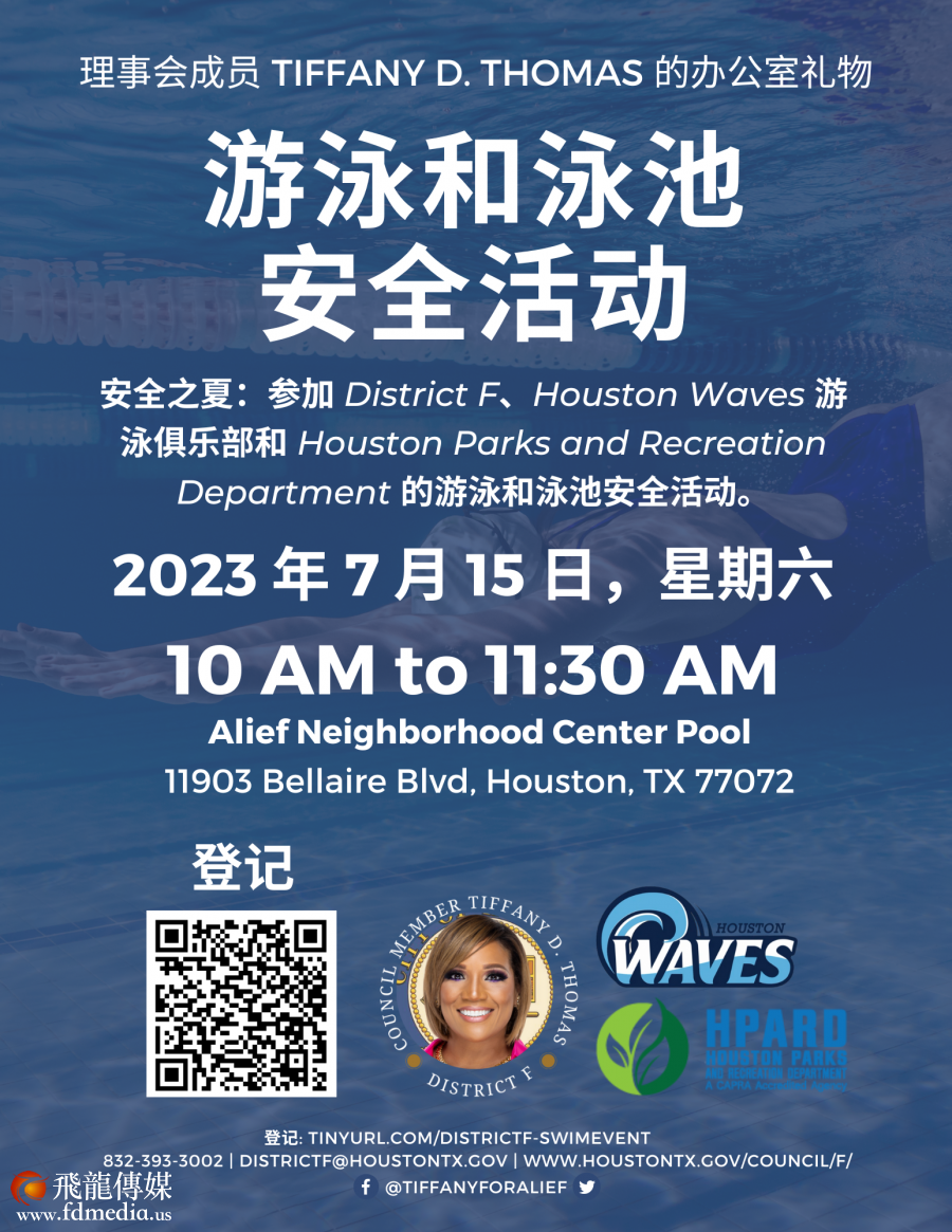 • 游泳和水上安全研讨会:7 月 15 日上午 10 点在 Alief Neighborhood Centre 举行。