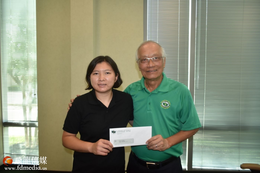 吴文龙董事长把五万美金的支票交到Winny Wang手中