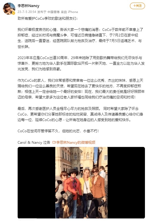 今晚,李思林Nancy 发微博——致所有爱护CoCo李玟的歌迷和朋友们: