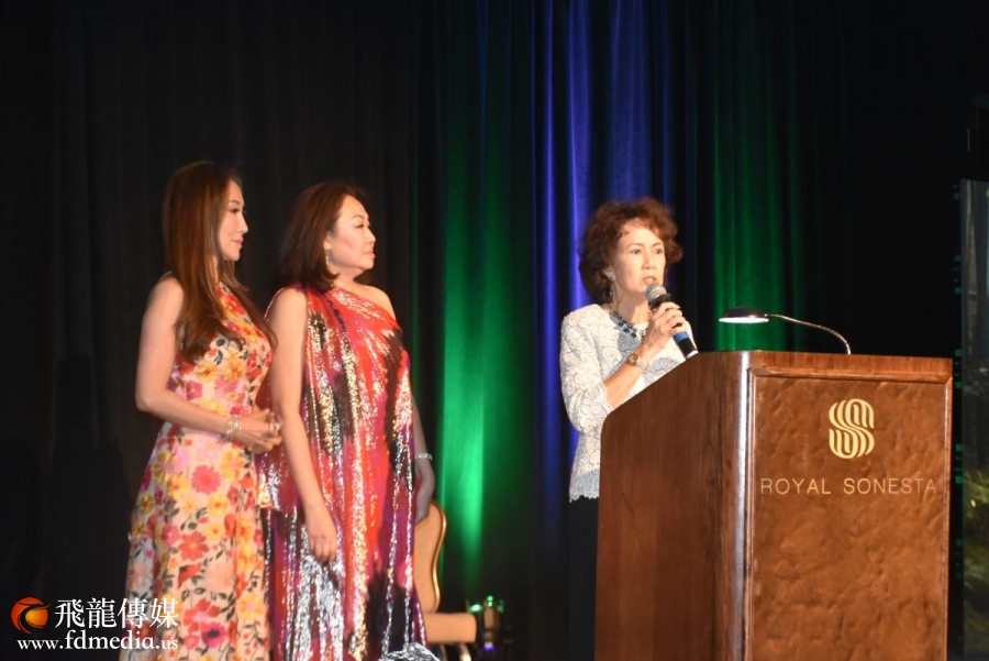 同源会主席Alice Hung和晚会共同主席Grace Lynn(中),Mandy Kao(左)登台致辞