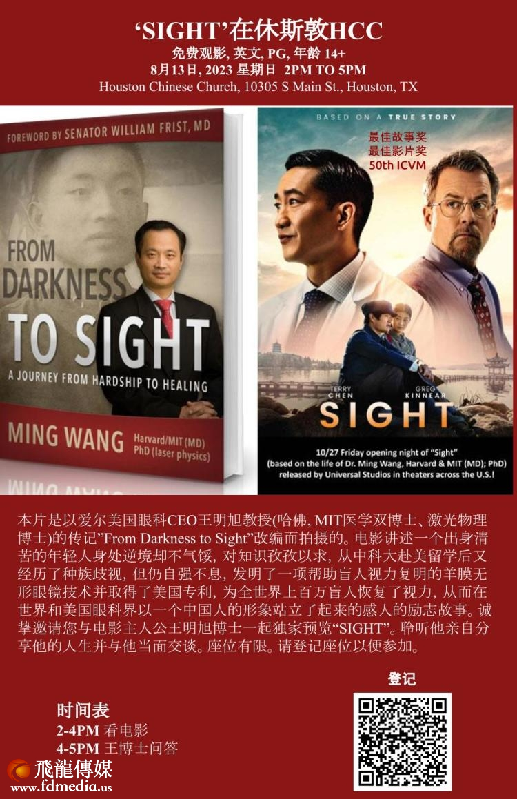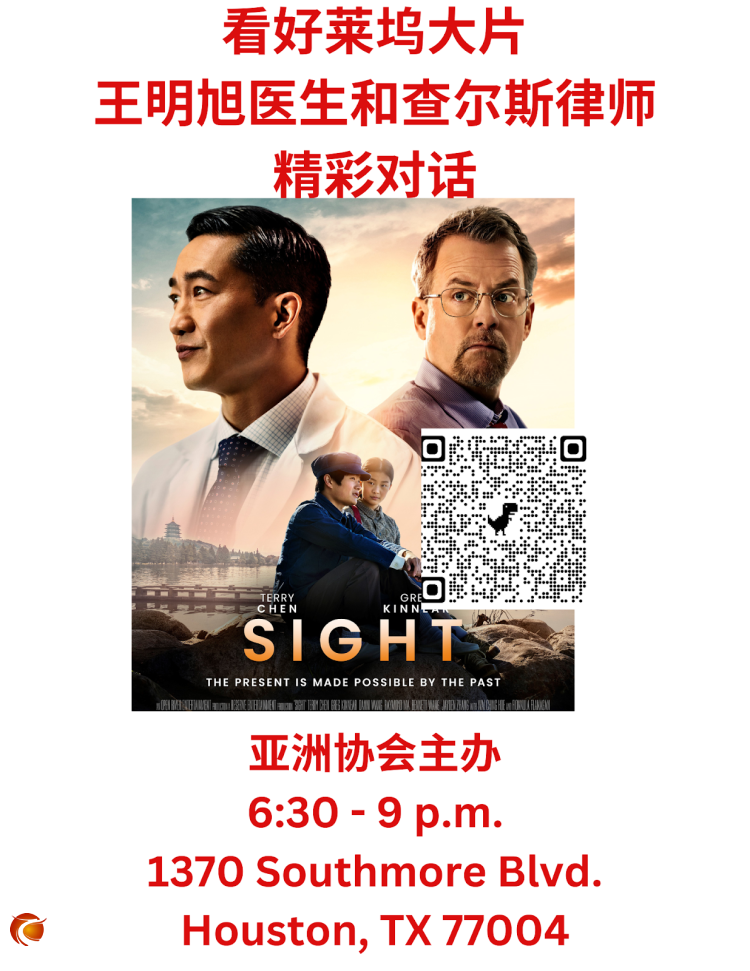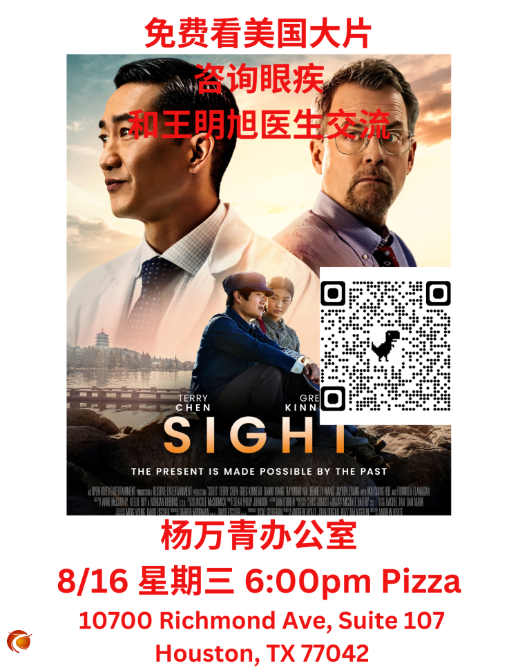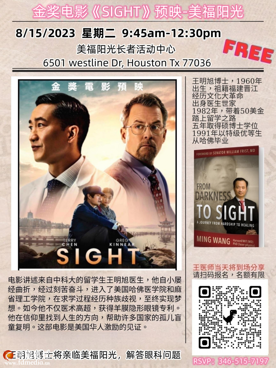 期待已久的享有全美国盛誉的最新好莱坞电影Sight以及王明旭医生见面会活动终于将于8/11-20为期10天13场预演活动即将在休斯敦拉开帷幕。电影Sight休斯敦10天行13场都在哪里?怎样计划看电影的最佳方案? 请选择一场下载海报然后扫码注册。