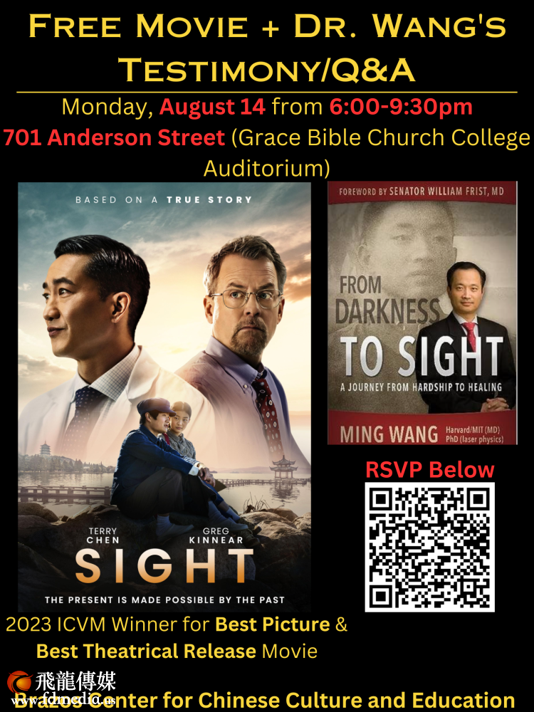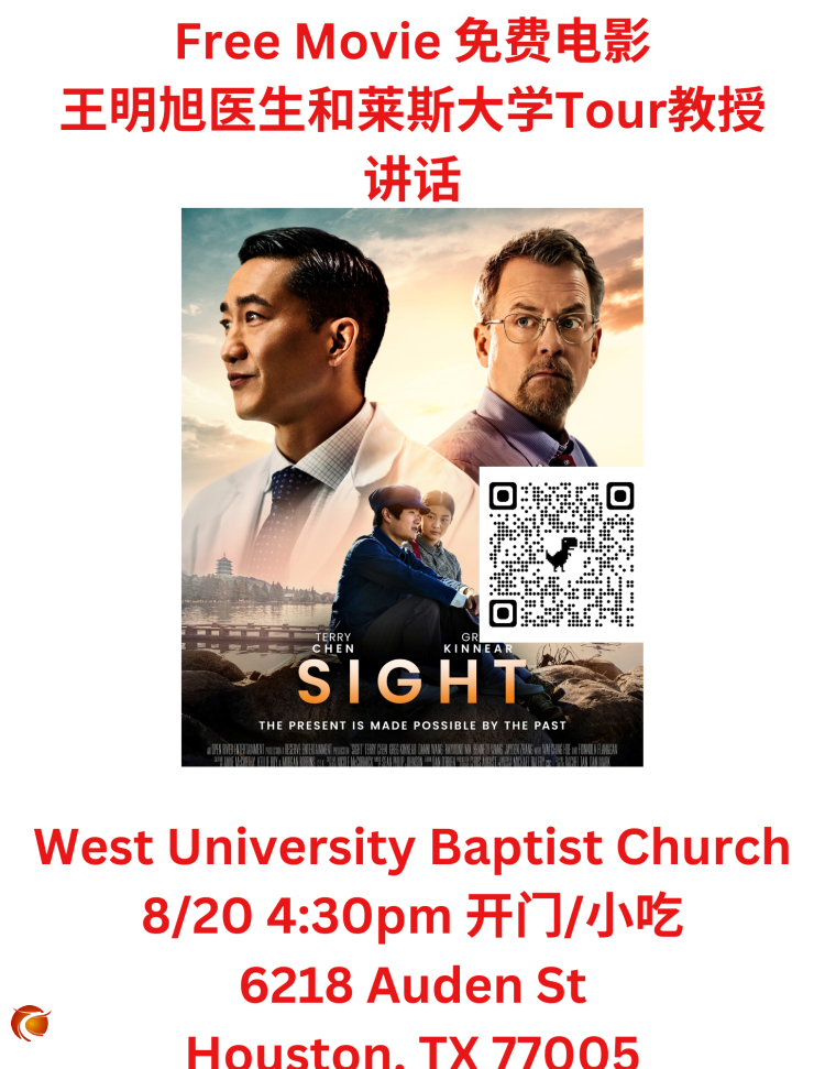 在梨城的居民有福了,8/11 梨城华人教会为社区播放Sight并且请王明旭医生讲话 。