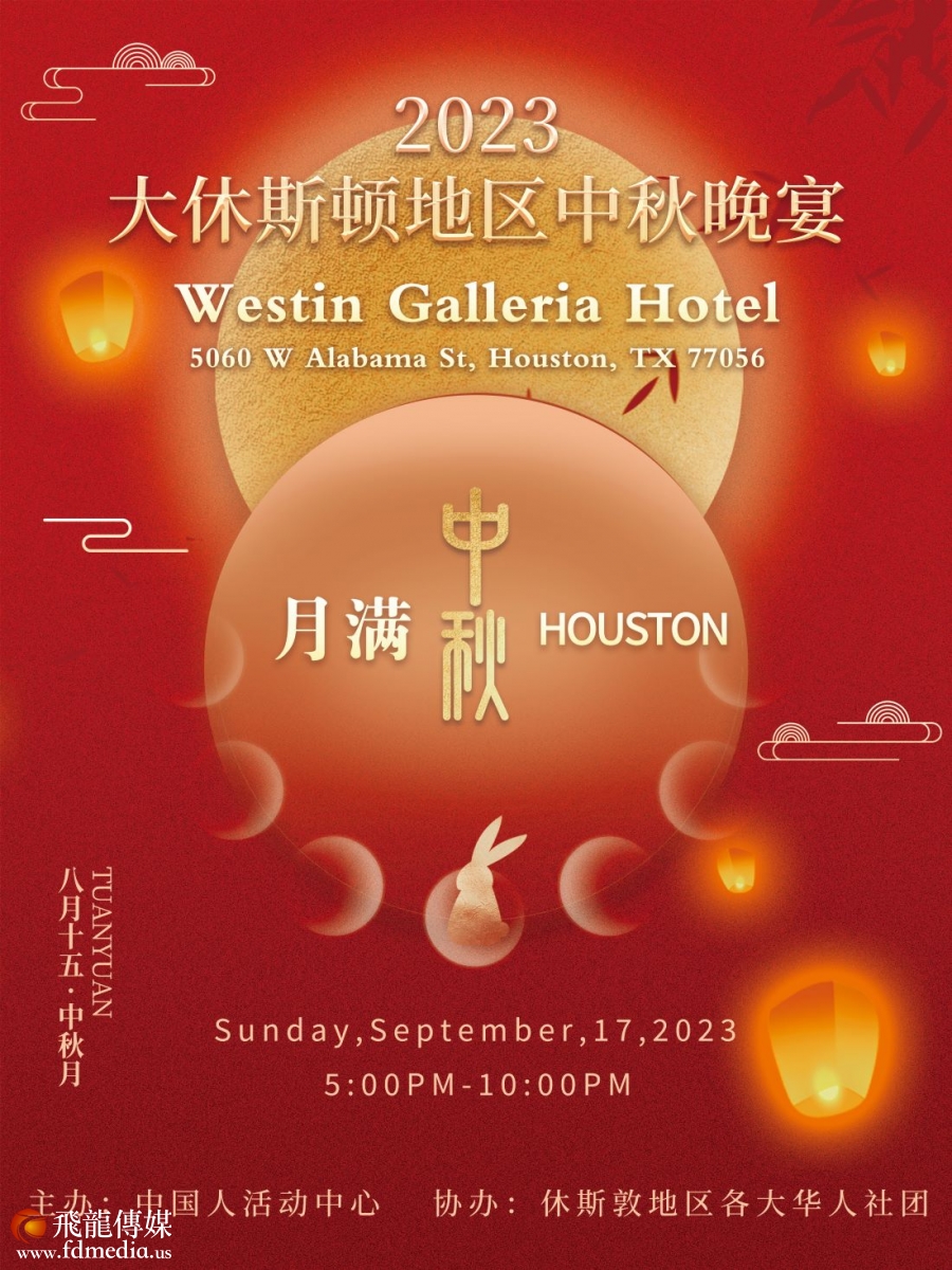 中国人活动中心联合大休斯敦地区各个华人华侨 60 个以上社团将于 9 月 17 日晚在休斯敦 Westin Galleria Hotel (5060 W Alabama St, Houston, TX 77056)大酒店隆重举行盛大中秋庆祝 晚宴。
