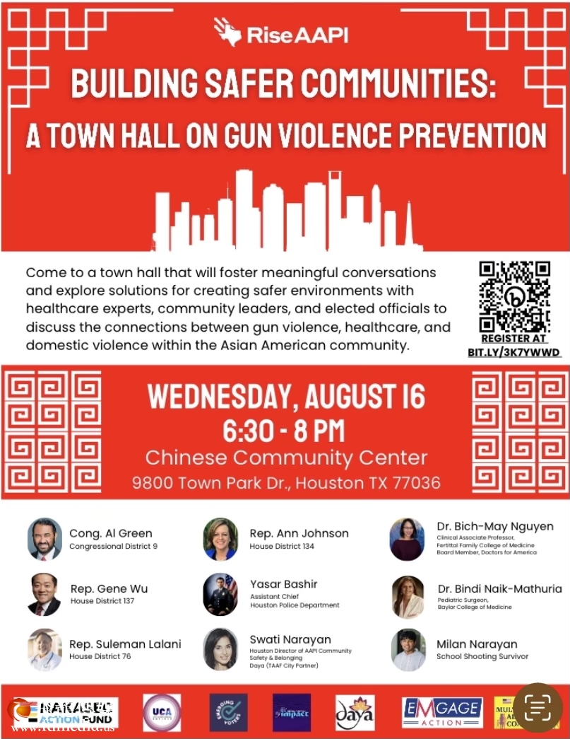 8月16日周三晚上6:30,在休斯敦中国城的Chinese Community Center有社区安全大会,题目是“怎样打造安全的社区- 枪支暴力防治”活动邀请了政府官员,警察局官员,著名健康专家和各族裔社区领袖等,从不同的角度和方位来表达看法,提出建议和意见。