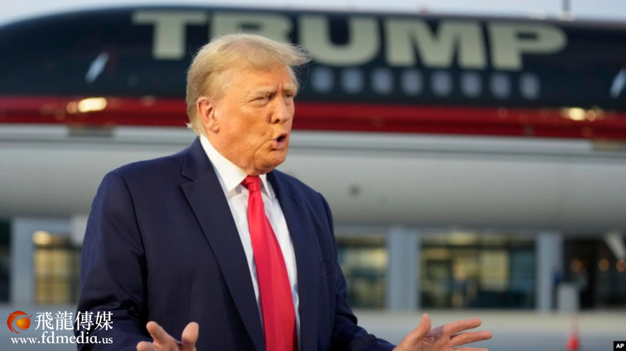 资料照片:前总统唐纳德·特朗普在亚特兰大富尔顿郡投案后离开时在机场对媒体发表简单讲话。(2023年8月24日)