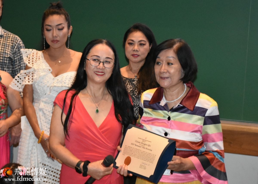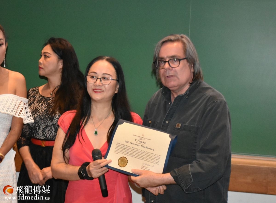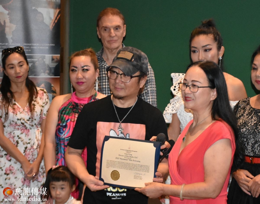 国会议员希拉 . 杰克森 .李亚裔代表罗玲代表国会议员向导演梁晨颁发褒奖状。