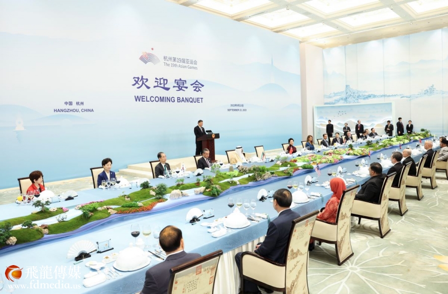 9月23日中午,国家主席习近平和夫人彭丽媛在浙江省杭州市西子宾馆举行宴会,欢迎来华出席杭州第19届亚洲运动会开幕式的国际贵宾。