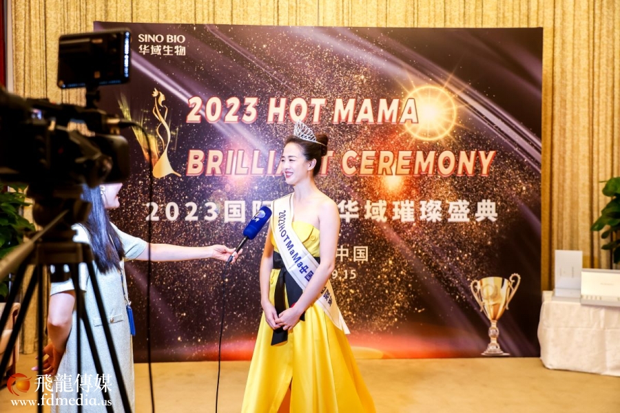 获得2023 HOT MAMA 国际大赛中国赛区冠军的崔玉珊接受电视台采访