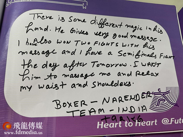 "他们有一双神奇的手,让我体验到了最棒的按摩。经过医生专业的按摩理疗后,我成为两场拳击比赛的胜利者。“印度拳击队队员NARENDER为”神秘的东方力量“点赞。