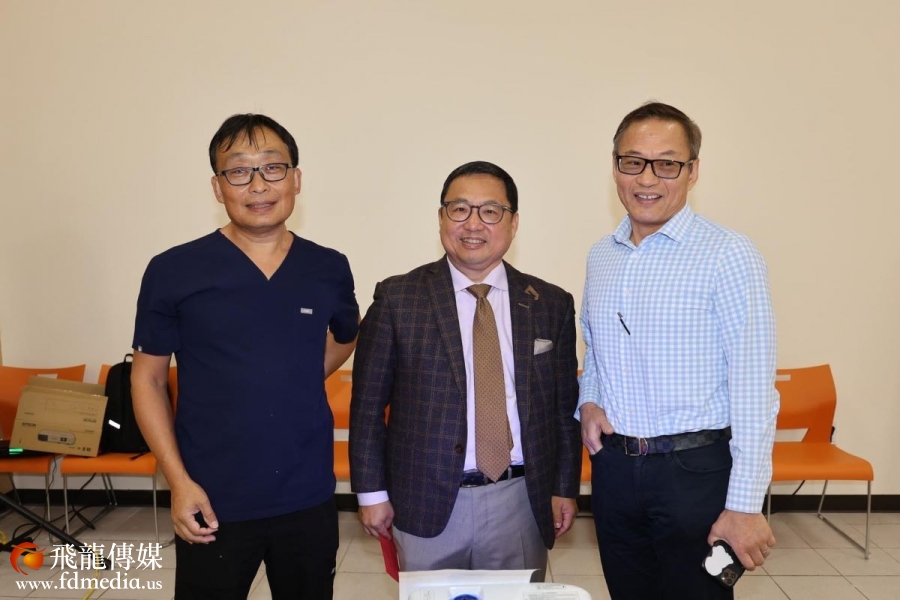 美福陽光長者活動中心董事长喻斌、著名心臟科醫生豐建偉、著名医生范缜合影。