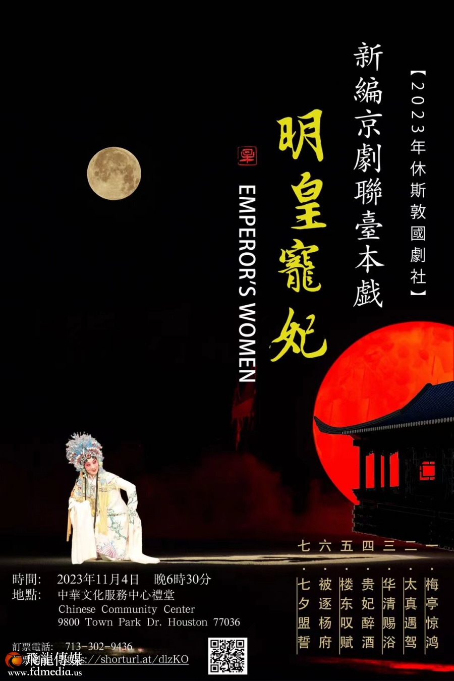休斯敦国剧社将於 2023 年 11 月 4 日星期 晚 6 时 30 分在中华文化服务中心小剧场上演 七幕京剧《明皇宠妃》。今年是休斯敦国剧社成立 40 周年,为了庆祝和展示国剧社一如 既往对国粹艺术的追求和弘扬,特别献上经过多年努力打造的新剧《明皇宠妃》。