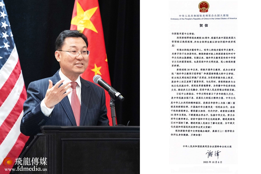 在华夏中文学校创立30周年之际,休斯顿市长特纳颁发贺函,命2023年11月5日为“华夏中文学校日”,中国驻美大使谢峰也特意发函,祝贺华夏中文学校30年华诞,此外糖城、斯坦福、梨城、休斯顿西南区管委会等也纷纷发函,表示祝贺。