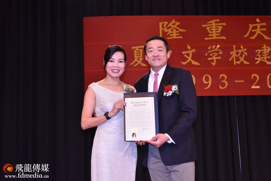 德州众议员吴元之(右)向华夏中文学校理事长陈宇雯颁发贺函。