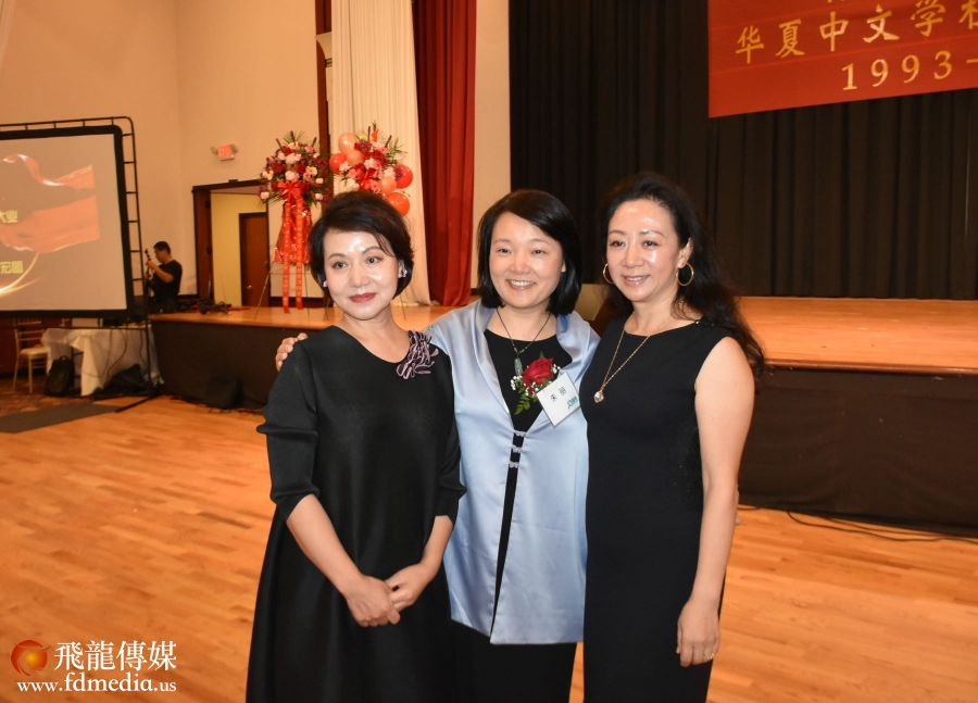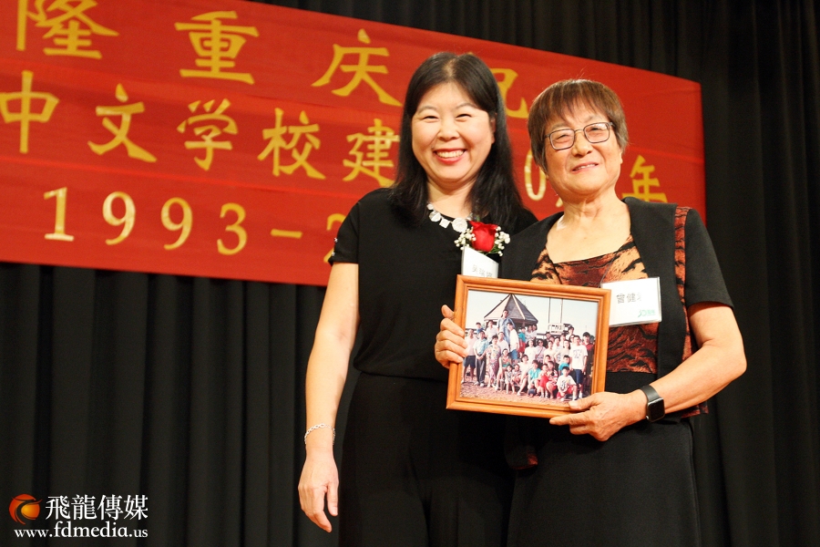 为华夏服务超过二十五年的常务副校长关丽华、中文老师王兴平以及前理事长唐艺杰颁发感谢状。